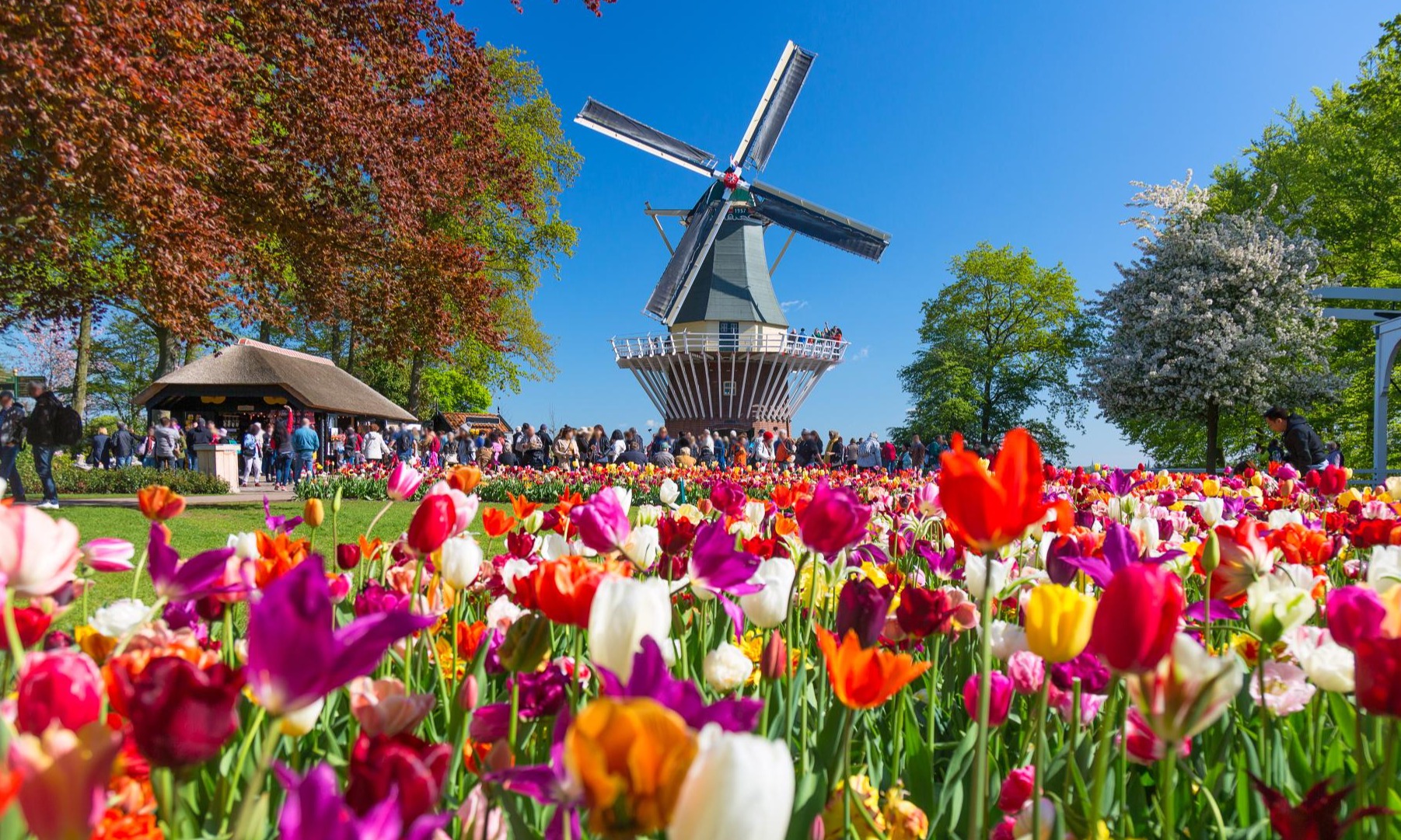 Tag 4: Freuen Sie sich auf den Keukenhof, den schönsten Frühlingspark der Welt! Auf 32 Hektar erwarten Sie kunstvoll angelegte Beete, blühende Pavillons, Wasserspiele und kreative Blumenmosaike. Danach besuchen Sie eine traditionelle Holzschuh- und Käsefabrik – mit Verkostung von echtem Gouda und spannenden Einblicken in das alte Handwerk.